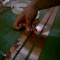 - Tagliare delle strips (strisce) di rame e incollarle lun go le linee verticali della vetronite; essendo le strips larghe 2,5 cm risulteranno a una distanza fra loro di 0,7 cm.